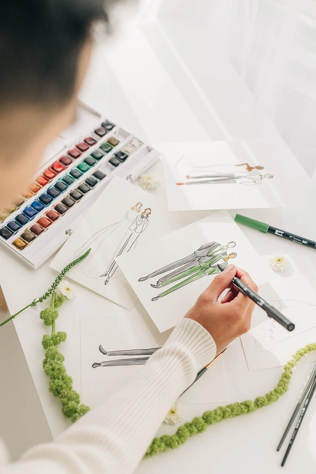 Preparing the Tools: Obviously, days before your event, I gather all necessary supplies, including high-quality watercolor paper, a variety of brushes, brush pens, and a palette of watercolor paints. Each tool has been hand selected as my favorite tools and they all play a specific role in creating the details. Here are the specific tools that I use: