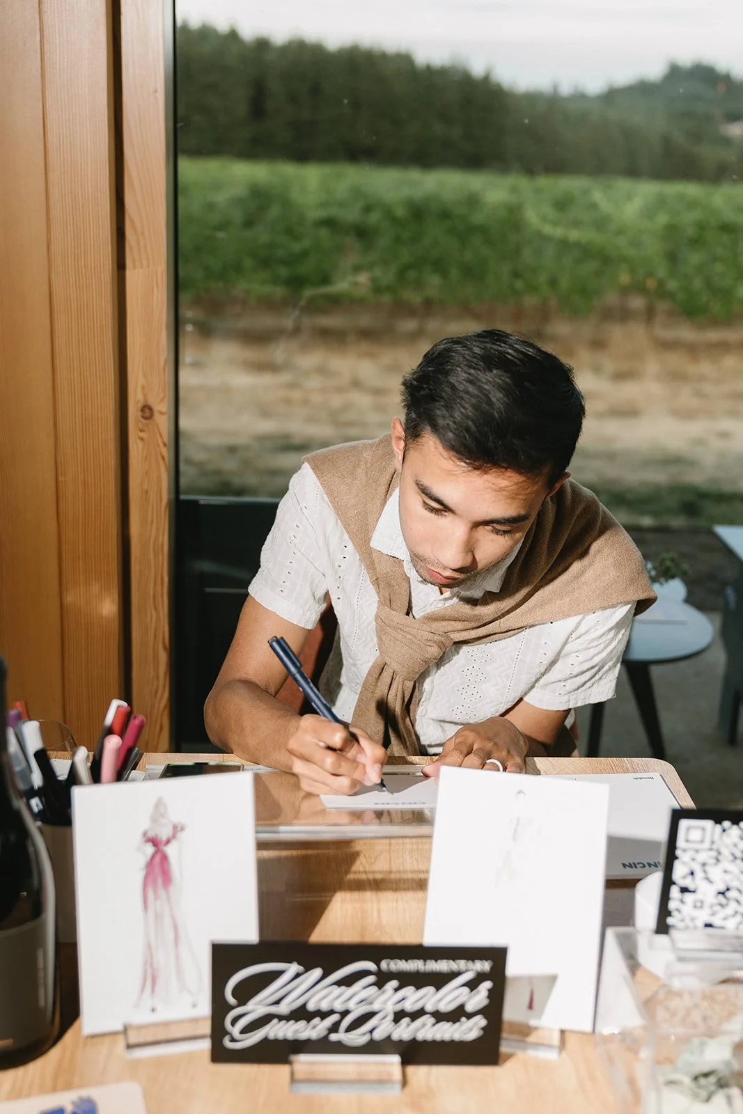 I’m Danison, the artist behind Bowtie & Brush. I specialize in live watercolor guest portraits, calligraphy, and engraving for weddings, brand activations, and events. As a proud gay Filipino American, my work is all about connection and making experiences feel extra special. I’ve painted at over 100 events and I’m always looking for ways to make live art more immersive—like painting with wine straight from the vineyard.